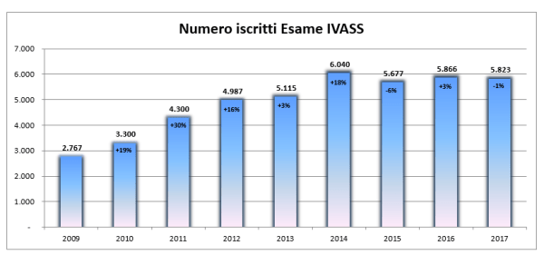 L’IVASS ha ricevuto per la sessione d’esame di quest’anno 5.823 domande di partecipazione. Il numero è sostanzialmente stabile rispetto allo scorso anno in cui i candidati erano arrivati a 5.866.