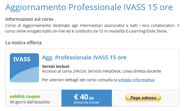 Abbiamo avviato già da alcuni anni una collaborazione con una primaria società di formazione assicurativa, la Atoma, per offrire a tutti coloro che ci seguono il Corso a distanza di 15 o 30 ore valido ai fini dell’Aggiornamento Professionale Obbligatorio annuale (Reg. ISVAP 5/2006) ad un prezzo imbattibile di € 40 + iva per le 15 ore e € 60 + iva per le 30 ore.