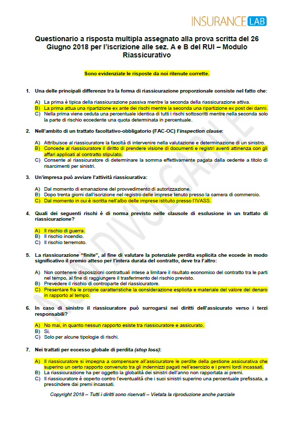 Con la speranza di farvi cosa gradita e nello scusarci anticipatamente per eventuali errori nella correzione, vi riportiamo (a titolo puramente indicativo e nell’attesa della correzione ufficiale da parte dell’IVASS) le domande somministrate (per il modulo assicurativo) con l’indicazione della sola risposta da noi ritenuta corretta.