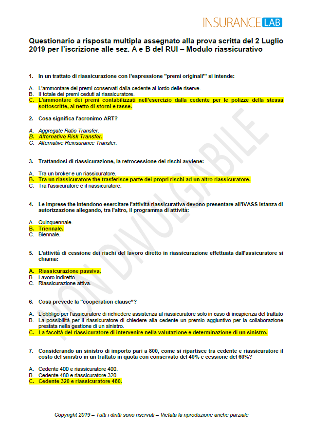 Con la speranza di farvi cosa gradita e nello scusarci anticipatamente per eventuali errori nella correzione, vi riportiamo (a titolo puramente indicativo e nell’attesa della correzione ufficiale da parte dell’IVASS) le domande somministrate (per il modulo riassicurativo) con l’indicazione della sola risposta da noi ritenuta corretta.