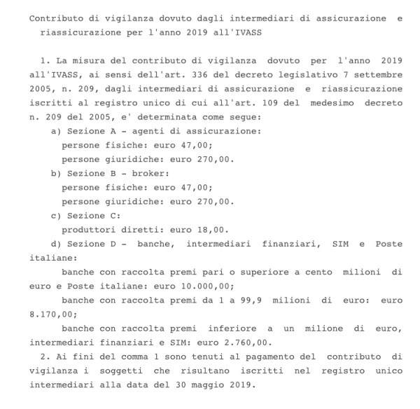 Rimangono invariati rispetto allo scorso anno i contributi che dovranno versare gli Agenti e i Broker, mentre aumentano quelli per la sez. D. I contributi sono fissati come segue: