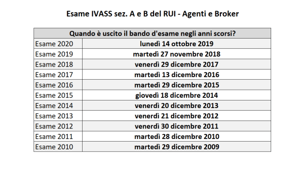Comincia l’attesa degli aspiranti agenti e broker per il prossimo Esame IVASS sez. A e B del RUI. Nei prossimi giorni è infatti attesa l’uscita del bando d’esame che negli anni precedenti è stato pubblicato a Dicembre nelle date che trovate indicate di seguito, ma che l’anno scorso fù pubblicato eccezionalmente già ad Ottobre. Non è escluso che l’IVASS per motivi organizzativi pubblichi quest’anno già a Novembre il nuovo bando: