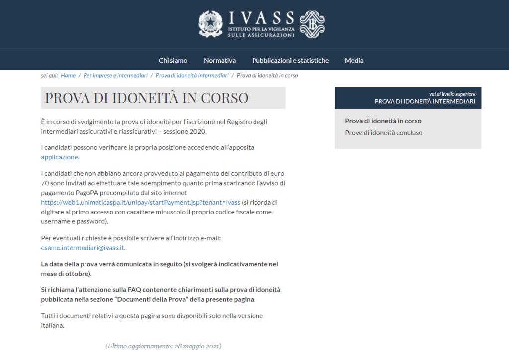 L’IVASS ha comunicato oggi sulla pagina del suo sito relativa alla prova d’esame in corso che la data della prova verrà comunicata in seguito e che si svolgerà indicativamente nel mese di ottobre.