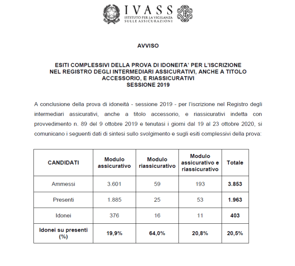 Con l’occasione l’IVASS ha reso noto i dati ufficiali di sintesi relativi alla prova di idoneità dello scorso 4 – 8 Ottobre per l’iscrizione alle sez. A e B del nel RUI.