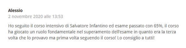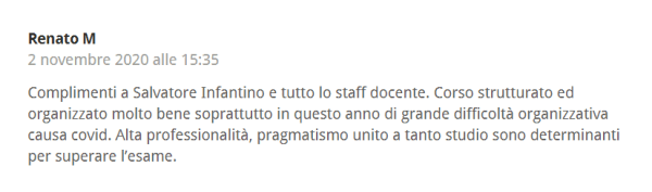 È prevista una simulazione finale della prova scritta d’esame e un follow-up del corso, sempre in diretta/live streaming, alla presenza di tutti i docenti, in cui si analizzeranno le domande d’esame più ricorrenti all’esame IVASS e le domande più complesse delle diverse discipline oggetto d’esame. Concluderà questa giornata il dott. Infantino con una presentazione focalizzata sulle strategie per affrontare al meglio la prova e superare il test d’esame IVASS.