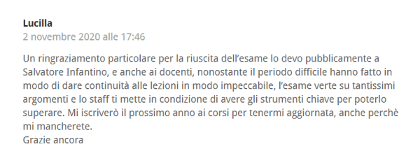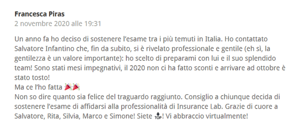 Nell’ultima giornata di corso si svolgerà un incontro di follow up finale, alla presenza, – in live streaming – di tutti i docenti dello staff di Insurance Lab, in cui verrà erogato in diretta un test ai Partecipanti con la selezione delle domande IVASS più frequenti e più complesse rispetto al programma di studio. Il test sarà analizzato e commentato dai docenti e da Salvatore Infantino insieme ai Partecipanti.